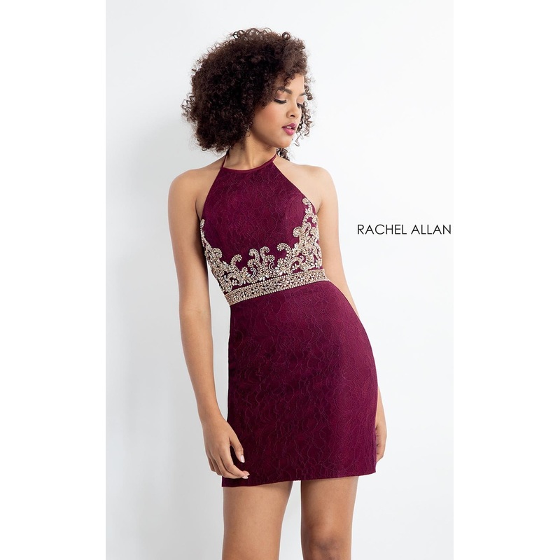 Look Dazzling in this Rachel Allan 4611 Dress by Rachel Allan. This dress features Column, eoy2019, Glittering Accents, Halter, Homecoming Dress, Homecoming Dresses, Lace and Embellishments, Mini, Natural, No, Party Dress, Prom Dress, Purple, Sleeveless, Two Piece